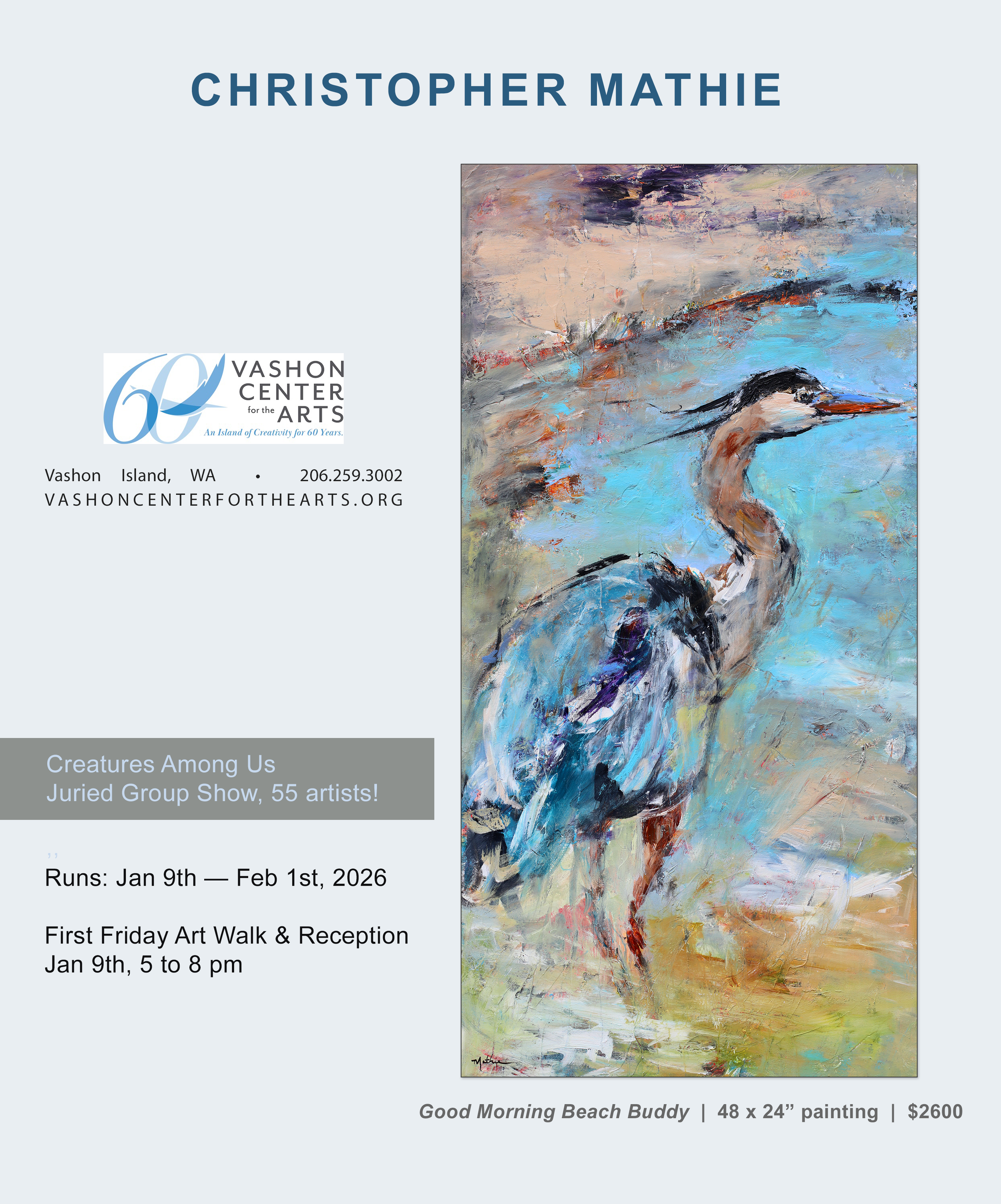 Christopher Mathie paints in a style he calls "emotional semi-abstraction." His work can be seen at a variety of Pacific Northwest galleries, including Gallery 903 in Portland, Gallery Mack in Seattle, Howard/Mandville Gallery in Kirkland and White Bird Gallery in Cannon Beach.