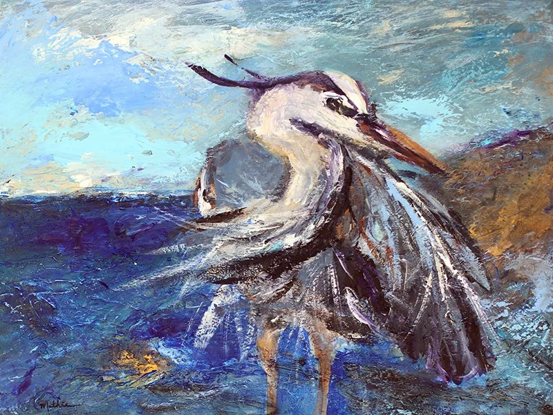 “Heron Pondering the Sea,” Acrylic, 60 x 48 inches.